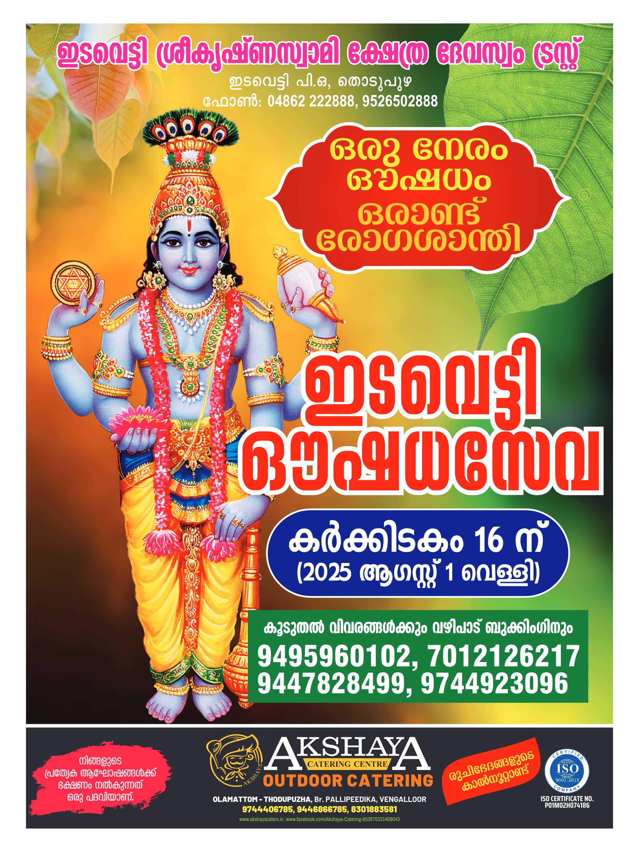 Miracles of ailments and diseases getting cured, have been reported by thousands of devotees every year after the consumption of Oushadha (Ancient Ayurvedic Medicinal Preparation) @ Sree Krishna Swamy Temple, Edavetty, which is more than 5000 years old.